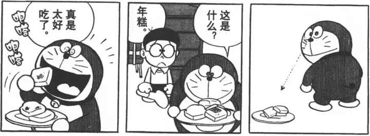 相比之下,「ドラ」这个词的含义在互联网上出现了不少争议。很多人都觉得这个词来源于铜锣烧(「dorayaki」,どら焼き/銅鑼焼き),因此哆啦A梦的意译应该是「铜锣卫门」。然而,哆啦A梦喜欢铜锣烧的设定是1971年新加的,远远晚于这部作品开始创作的1969年。如果大家翻开漫画的第一卷第一话就能看到,最早出现的哆啦A梦爱吃的食物其实是年糕。藤子老师本人也亲口说过:
